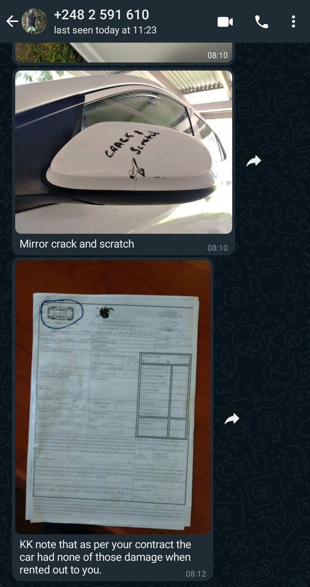 I requested photos of the damages listed in the quotations. The photos were sent to me by Mr Darrel (+248 2 591 610) on 18 January 2021 by WhatsApp with a note that “as per your contract the car had none of those damages when rented out to you” with as small car logo marked in upper left corner as alleged place where damages were supposed to be marked. I was surprised to learn that small car image on the contract is supposed to be a schematic to mark damages!